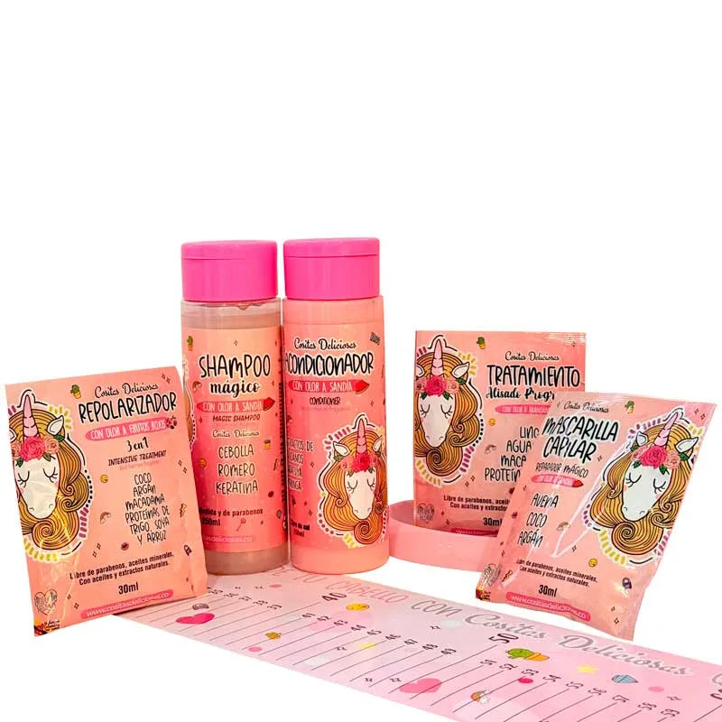 Este kit será ideal para crecimiento y suavidad, diseñado para quienes desean una rutina completa perfecta para crecimiento, suavidad, hidratación y mucho brillo Apto para todas las edades y tipos de cabello. Línea vegana 🌱 libre de sal y parabenos. Kit contiene: 1. Shampoo mágico 250ml + 1.Acondicionador sandía 250ml + 1 sachet repolarizador 30ml + 1 sachet tratamiento alisado progresivo 30ml + 1 Sachet mascarilla capilar 30ml + 1 Metro mágico.